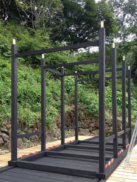 最終段階でゲリラ豪雨襲来。途中で止めるわけにもいかず強引に組み付け、建て方完了。この後竹格子を打ち、屋根によしずを葺き完成です。