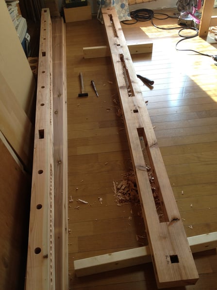 茶屋の土台には追加加工。中央に木輪の納まる溝を掘ります。まずドリルで大まかに整形。