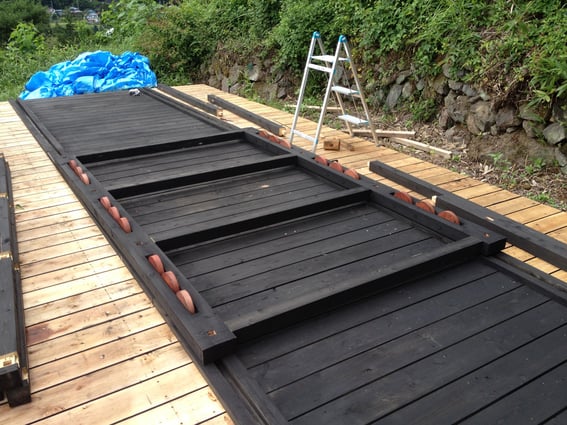 塗装と加工の終わった茶屋の部材を荷揚げします。