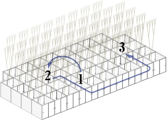 - 最初に入る部屋は正面から選ぶ。入口で「卦立て札」「部屋割り札」を受け取る。入室後、卦立て。結果は次の部屋の番号。「卦立て札」からは次に行くべき部屋番号を読み取り、部屋の配置は「部屋割り札」を見ながら把握する。