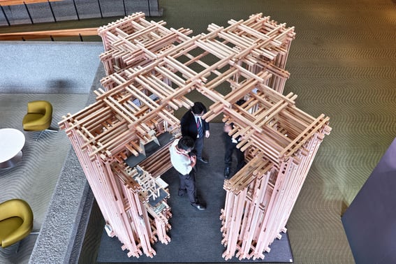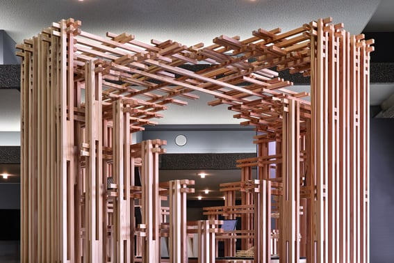 京都にて開催された木質建築を推進する国際イベントに向けて、木材の新接合法を活用した展示空間をデザインした。日本建築は、時代ごとの意匠的・技術的革新を継承して新たな伝統をつくってきた。その革新の継承を空間デザインに体現することで、現代とつながる新たな伝統木造の提示と実証を目指した