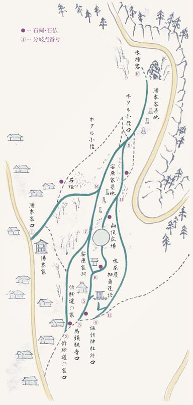 里山をめぐる順路は重複しない12のパターンに分けられ、そのそれぞれに一つの願意が対応しています。巡回者は自分のかなえたい願いにあてはまる経路を、地図に従って歩くことで作品に参加します。